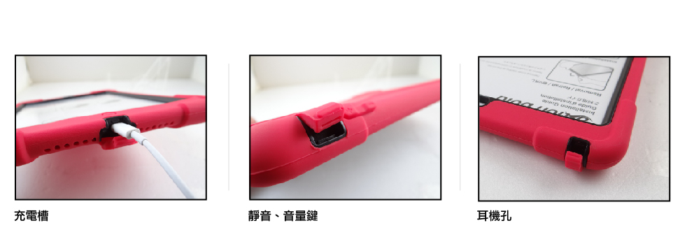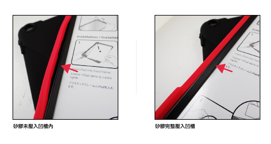 注意!Hobbes有个地方一定要提醒大家注意,将平板电脑安置于内装壳后,扣上硅胶外壳时,请确认硅胶外壳皆与内装壳完全扣入噢!接缝处必须是平整无掀起(如右图示),这样子才能确实做到防水功能。