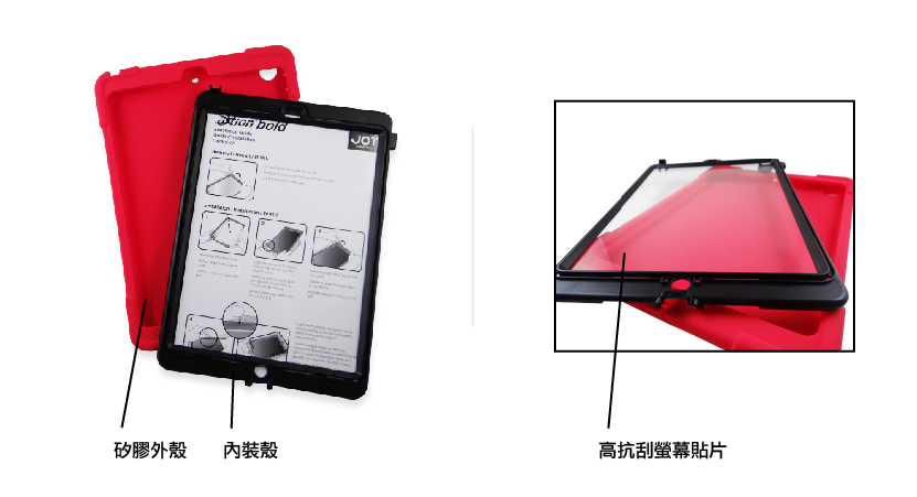 将aXtion Bold硅胶外壳拆卸下来后,有一黑色内装壳能将iPad Air稳固的安置于壳中。萤幕上的高抗刮萤幕贴片并不会影响使用操作,让你操控灵敏不受限,提供更完全(防水、防刮)的防护。镜头上的保护片不仅能保护镜头也能维持原有的拍照品质。