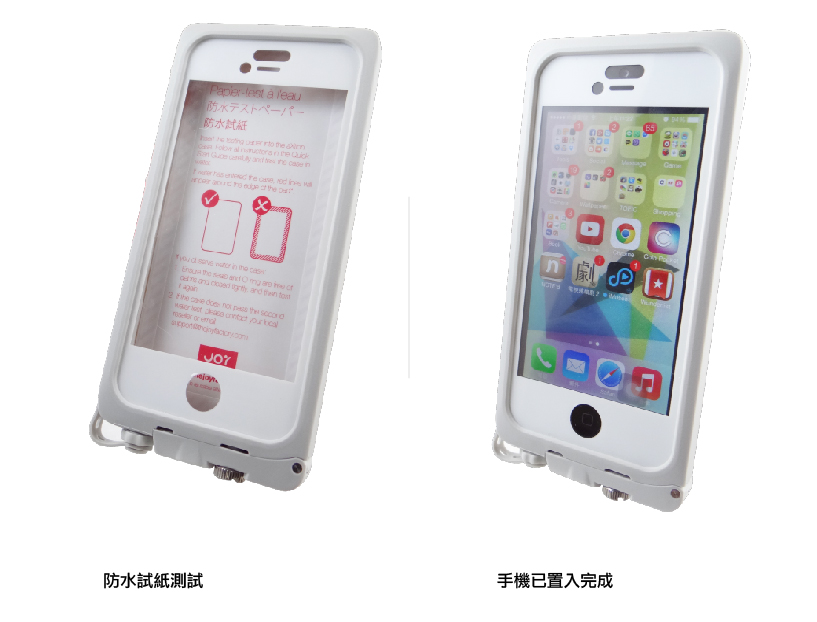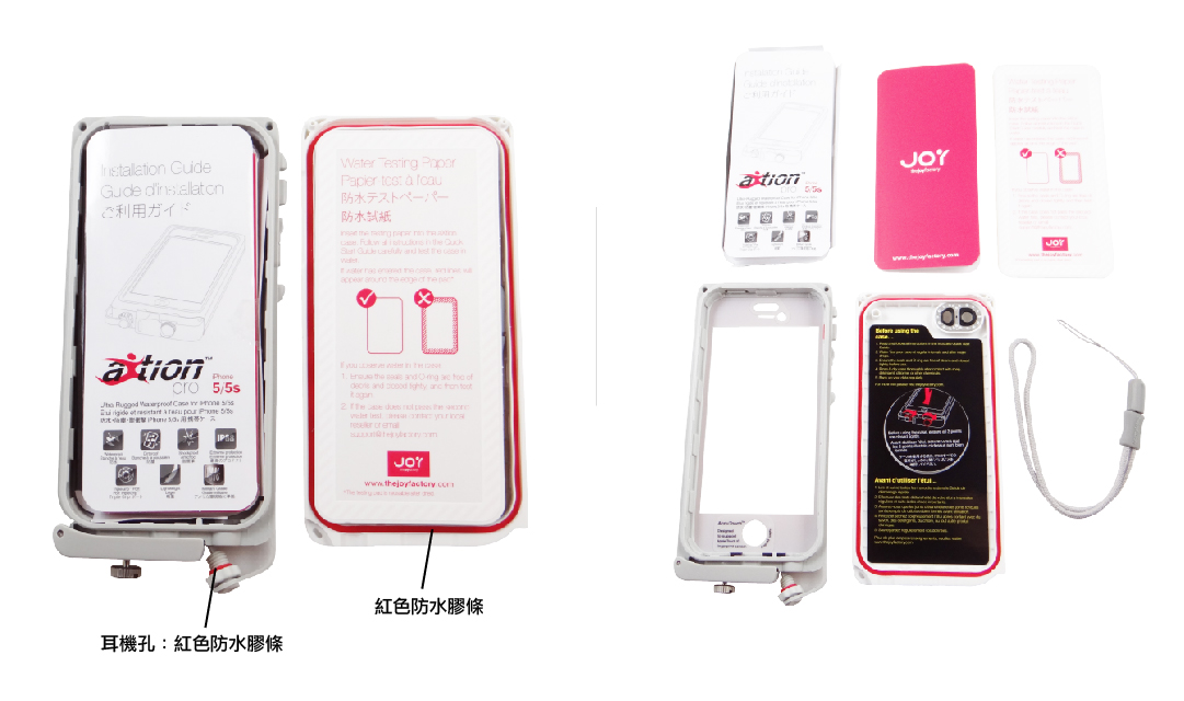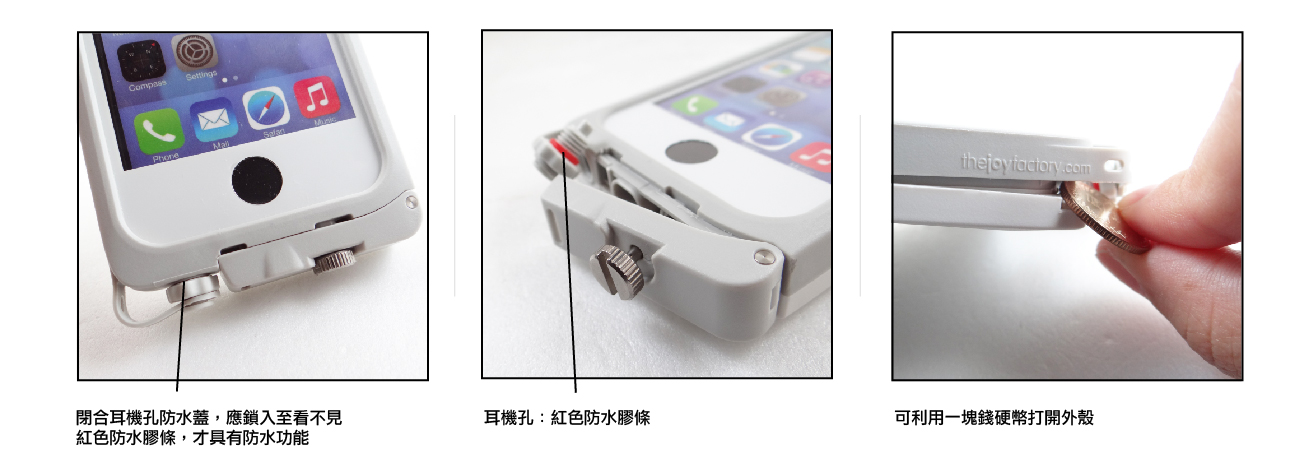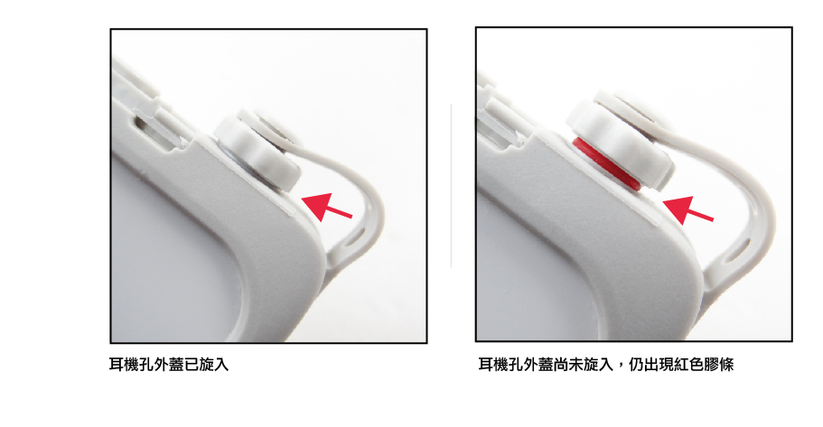 提醒大家装入手机前,请先使用附赠的防水试纸进行测试,确认外壳的防水性无误后再将手机装入。请务必记得每一个孔盖皆已密闭才具有防水效果噢!耳机外盖上的红色防水胶条,锁入时请转至看不到红色防水胶条才算是完成防水准备!