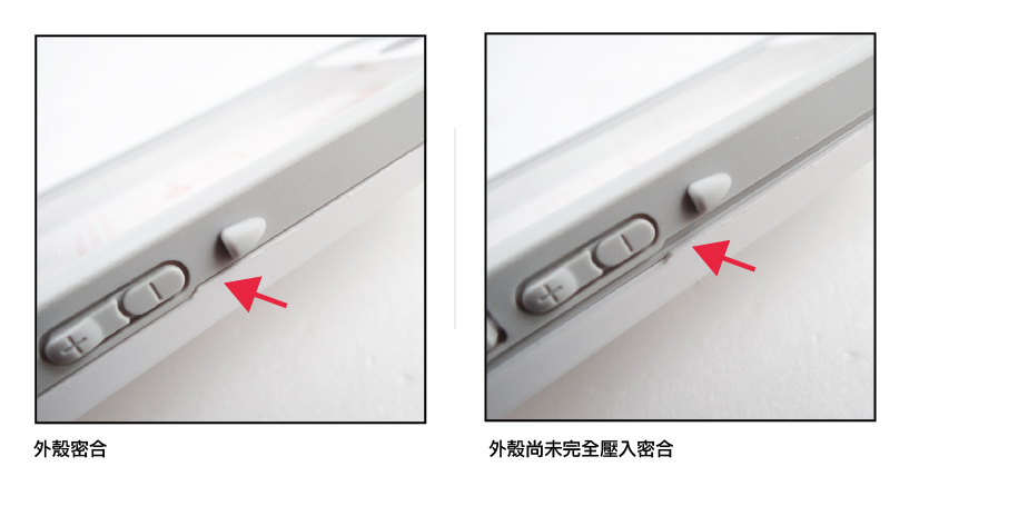 将手机置入外壳后,必须将外缘紧密扣入,在测试的过程中必须四边都压入,确认外壳边框已密合。