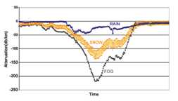 因为FSO技术以大气为传输媒介,传输的雷射光波长会因天气(雨、冰雪、灰尘、雾)因素影响。当天气状况不好时,会对FSO的雷射光波产生衰耗作用,大气中的射散粒子会导致光波的产生空间、时间、角度上不同的偏差。而大气中的粒子也许会吸收雷射光的能量,使得信号功率衰减。如上图不同的气候中雷射光波衰减的关係图中可看出,『浓雾』对于雷射光波的影响最大,其次是下雪与下雨的天气状况。
