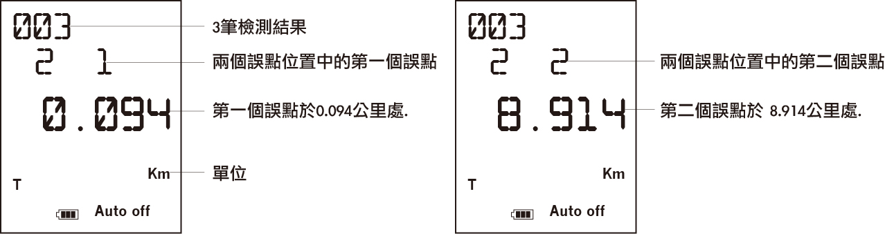 handyOTDR最多能于一条线缆中找出八个误点位置,如果检测到线缆不止一个误点时,LCD萤幕中会显示出『2 1』、『2 2』的误点事件编号,此组数字第一个数字表示该条线缆中总共有两个误点位置,第二个数字表示两个误点位置中的第一笔资料及第二笔资料,即为:『2 1』为两个误点位置中的第一个误点、『2 2』为两个误点位置中的第二个误点,事件标号下方会有误点位置数据。