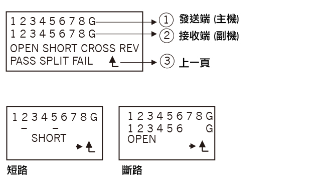 CABLE TEST能檢測出線纜斷路(open)、短路(short)、錯絞(mis-wire)和分叉(split)等情況,並以Pin to Pin(針腳對針腳)模式顯示測試結果,共有以下三種檢測模式(WIREMAP、TWISTED MAPPING、SHORT LOCATION):