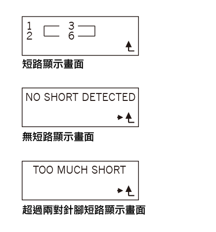 當發現線纜有一對短路的情況時,能於『WIREMAP』模式下得知短路的針腳,但如果有兩對針腳發生短路,『WIREMAP』僅只總覽顯示出哪些針腳出現短路情況,無法提供詳細對應的資訊。於是『SHORT LOCATION』能明確的顯示出一對以上的針腳,以便於查看瞭解短路對應情況。提醒使用者如超過兩對以上短路螢幕上會顯示『TOO MUCH SHORT』。