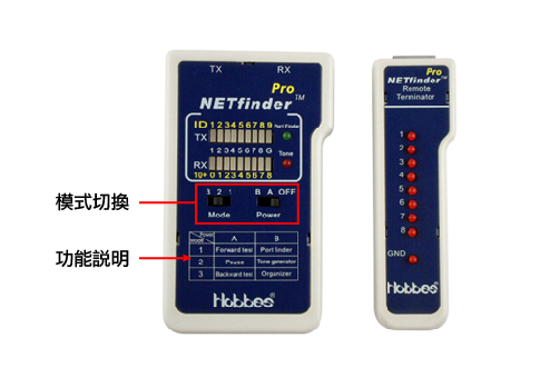 NETfinder Pro採循環偵測線纜引角對應(open、short、mis-wire)情況,並以針腳對針腳(Pin to Pin)方式顯示線纜線序排列情況。但循環偵測顯示可能讓使用者錯失查看所需針腳對應的情況,Hobbes設計了能『倒退』的燈號顯示模式。