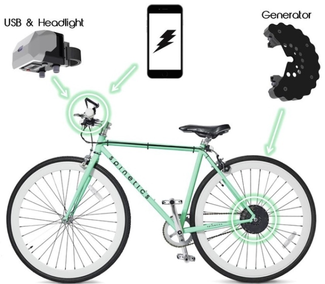 1. 附加於自行車上的套件,利用車輪轉動時,產生電力,點亮車頭燈,並且提供USB裝置充電,例如:智慧型手機、相機等USB裝置,相當實用。