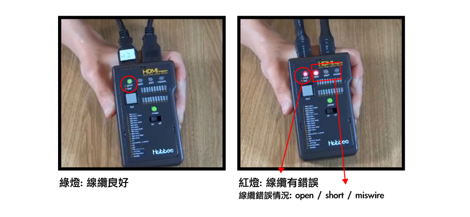 HDMI A Type線纜兩端接上HDMImapper,打開電源按下『test』鍵後,即可以測試線纜中19條針腳的狀況,燈號會有兩種顯示模式: