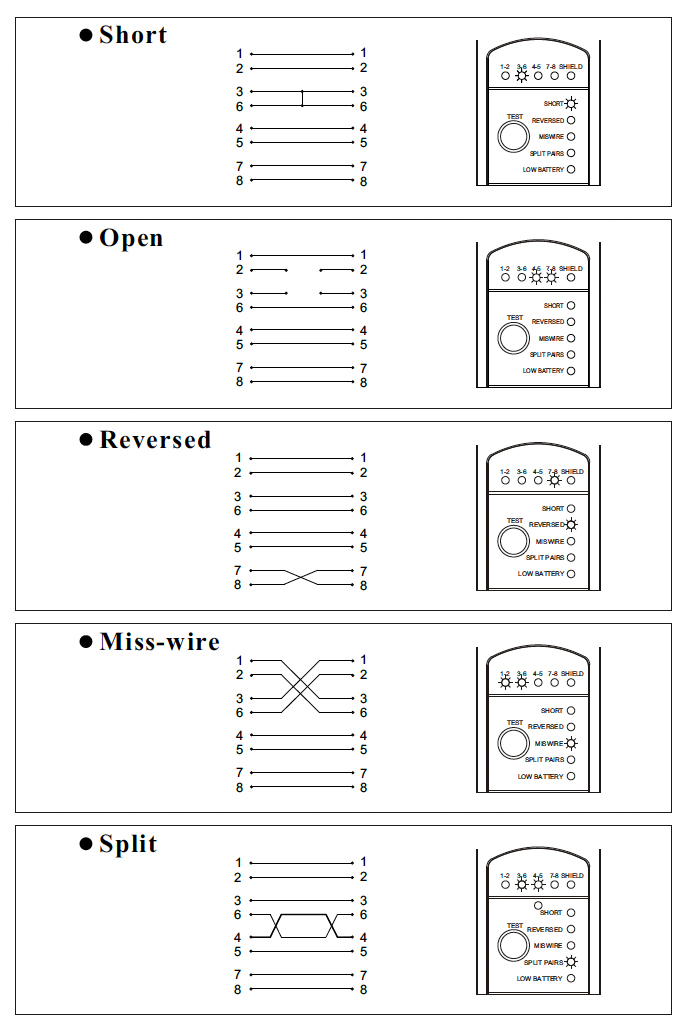 如果接上受測線纜後,發現某一對針腳的綠燈呈現閃爍狀態,表示該對針腳有錯誤狀況,同時對應狀況會於下方直排燈號以紅燈顯示。接著長按『Test』鍵兩秒後開啓『偵錯模式』,有錯誤的該對針腳會同時顯示綠燈(表示該針腳)及紅燈(表示錯誤狀況)。