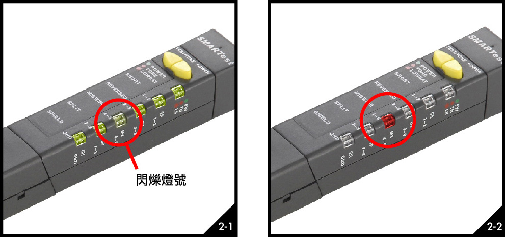 (2)引角對應狀況(如圖2-1、2-2):該對針腳如有錯誤狀況發生,會先以綠燈顯示出每對針腳的狀況,該對針腳如果發生錯誤,燈號顯示將會呈現閃爍綠燈狀態,接著會以紅燈顯示出引角對應狀況(短路Short、對絞Reversed、錯絞Mis-wire、分叉Split)。如使用者尚未看清楚燈號顯示,可按下『TEST』鍵將會再顯示一次燈號。